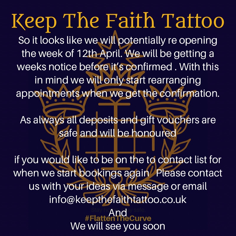 if you would like to be on the to contact list for when we start bookings again Please contact us with your ideas via message or email info@keepthefaithtattoo.co.uk